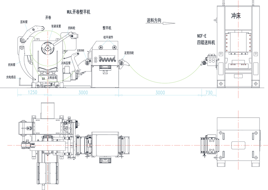 This precision roller leveling and feeding machine (3-in-1) perfectly meets the mold testing needs of mold manufacturers, satisfying the mold industry, especially automotive parts mold manufacturers’ needs for full-size, high-strength material trial production. It is an ideal platform for verifying and debugging the performance of various transfer molds, progressive molds, and single-engineering molds. During the mold testing process, the equipment, with its high repeatability and flexible feeding pitch settings, can quickly and accurately match the process requirements of different molds, effectively assisting in verifying the stamping stability, pitch accuracy, and forming effect of the mold.